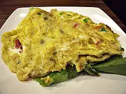 - Omelet, a dish made from beaten eggs quickly cooked with butter or oil in a frying pan