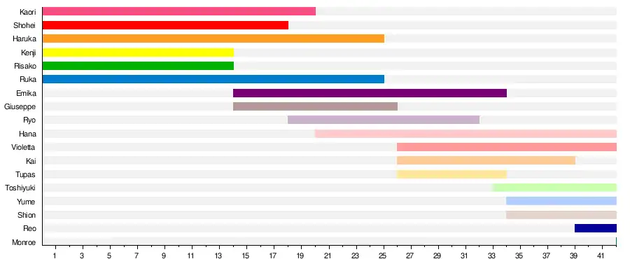 | 11 | Violetta Razdumina | ラズドゥミナ・ヴィオレッタ | Vivi | Aspiring actress | October 4, 1995 | 24 | 26 - 42 | 17 |