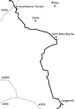 The northern end of the footpath starts in the car park on Walbury Hill. It passes through the towns of Romsey and Totton and the villages of Linkenholt, Ibthorpe, Hurstbourne Tarrant, St Mary Bourne, Longparish, Forton, Wherwell, Chilbolton, Stockbridge, Horsebridge and Mottisfont. The southern end of the footpath is at Eling Quay.