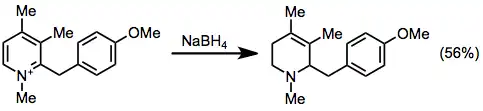 Partial reduction of pyridinium salts gives N-alkyltetrahydropyridines. Treatment of N-methylpyridinium with borohydride reagents gives 1-methyl-1,2,3,6-tetrahydropyridine.[1][2]
