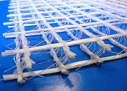 The characteristic features of TRC are its thin structure and malleable nature, as well as its ability to retain a high tensile strength; this is due to reinforcement in the concrete that uses long continuous fibers that are woven in a specific direction in order to add strength.[11] As the result of the varying strength and properties needed to support correct loading, there are many different types of yarns, textiles weaves, and shapes that can be used in TRC. The textile begins with a yarn that is made of a continuous strand of either filaments or staples. The yarn is woven, knit, glued, braided or is left non-woven, depending on the needs of the project.[13] Carbon, AR glass, and basalt are especially good materials for this process. Carbon has good tensile strength and low heat expansion, but is costly and has bad adhesion to concrete. Basalt is formed by melting basalt rock; it is more cost effective than carbon, and has a good tensile strength. The drawback of basalt is when it is placed in an alkali solution, such as concrete, it loses some of its volume of fibers, thus reducing its strength. This means a nano composite polymer coating must be applied to increase the longevity of the construction. AR glass has this problem, as well, but the positives of using AR glass in TRC structure, including its adhesion to concrete and low cost, outweigh these issues.[13]