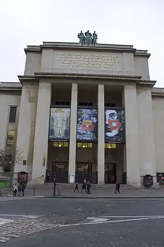 The Théâtre National de Chaillot (French pronunciation: [teɑtʁ nɑsjɔnal də ʃajo]; "Chaillot National Theatre") is a theatre located in the Palais de Chaillot at 1, place du Trocadéro, in the 16th arrondissement of Paris. Close by the Eiffel Tower and the Trocadéro Gardens—the Théâtre de Chaillot is among the largest concert halls in Paris.[1] It has long been synonymous with popular theatre and is especially associated with stars such as Jean Vilar and Antoine Vitez. In 1975 the French Ministry of Culture designated it as one of the four national theatres of Paris.
