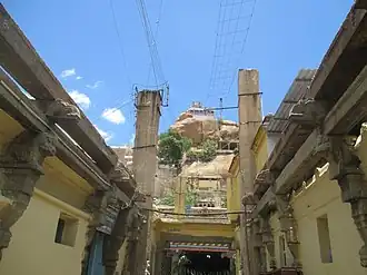 The Rockfort is a fortress which stands atop a 273-foot-high rock.[10] It consists of a set of monolithic rocks accommodating many rock-cut cave temples. Originally built by the Pallavas, it was later reconstructed by the Madurai Nayaks and Vijayanagara rulers.[11] The major complex in the temple are believed to be built during the 8th century by the Pandyan Empire.[12] The temple is maintained and administered by the Hindu Religious and Charitable Endowments Department of the Government of Tamil Nadu.[13]