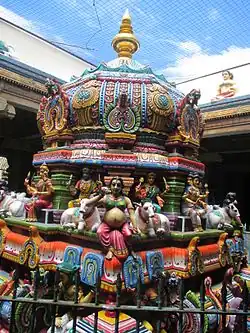 The temple celebrates dozens of festivals throughout the year. The Chittirai festival during the Tamil month of Chittirai (April - May) is celebrated for fifteen days, portraying the various incidents associated with the temple legend. The car festival is held on the ninth day, when the processional deities of Thayumanswamy and Mattuvar Kuzhalammai are taken out in separate chariots around the temple in NSB Road, Nandikovil Street, North and East Andar Streets and the Malaivasal.[18] The Karthigai festival is celebrated during the Tamil month of Karthikai, between November and December, concluding with the celebration of Karthikai Deepam. A huge lamp is lit in a cauldron, containing three tons of ghee, at the top of the Malaikottai hills during the Deepam. To mark the occasion, the festival deity of Thayumanaswami circumambulates the mountain.[19]