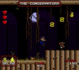 The Addams Family is a side-scrolling action-adventure platform game.[5] The story involves Abigail Craven scheming to obtain The Addams Family's secret wealth. To do this, she brainwashes Uncle Fester, who has just lost his memory, into being an ally, and is also aided by The Judge and the Addams' family attorney, Tully Alford, who takes control of the mansion. Morticia Addams, Pugsley Addams, Wednesday Addams, and Granny go to the house to meet with Tully about the property, only to be kidnapped within it by Abigail. When Gomez Addams gets home, he finds the other family members gone.[6][7] To save his family, Gomez runs, jumps, and squats his way throughout the large mansion invested with ghosts, mutants, monsters, bats and rabbits, as well as stage hazards like stars, swinging clock pendulums, and fire lakes.[8][9]