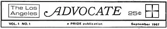 The Advocate was first published as a local newsletter by the activist group Personal Rights in Defense and Education (PRIDE) in Los Angeles. The newsletter was inspired by a police raid on a Los Angeles gay bar, the Black Cat Tavern, on January 1, 1967, and the demonstrations against police brutality in the months following that raid.[4] Richard Mitch (using the pseudonym "Dick Michaels") and Bill Rau (under the name "Bill Rand") joined PRIDE and, along with Aristide Laurent and artist Sam Winston, transformed the newsletter into a newspaper titled The Los Angeles Advocate.[5] The first issue bore a cover date of September 1967, and was sold for 25 cents in gay bars in Los Angeles. By early 1968, PRIDE was struggling to stay viable and Mitch and Rau paid the group one dollar for ownership of the paper in February of that year.[6] In 1969 the newspaper was renamed The Advocate and distributed nationally. By 1974, Mitch and Rau were printing 40,000 copies for each issue.[7]