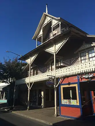 In about 1871 the company constructed what is known as The Arcade. The building, designed by the locally prominent architect Samuel Pratt, is a three-story wood frame construction, originally with gingerbread-decorated balconies in front and back. The lower two floors are both the full width of the building, although the first floor is punctured by a passage connecting Circuit Ave. to Wesleyan Grove. The third floor is significantly smaller than the lower floors.[2]