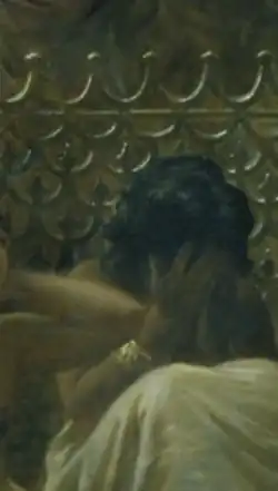 Imogen Hart points out that Herodotus describes the event taking place in the heart of a village, not an auction house, with the men of the village standing in a circle around the women, not a line.[25] She further observes that Long's painting however, is set in a building reminiscent of a modern auction house, the men gathering in a line, not a circle. Bohrer attributes this divergence of Herodotus' translation to Long's own artistic freedom or reimagining of the fable,[11] purposely abstracting the content of Herodotus to be more resonant with his 1875 audience. Hart attributes this divergence with Herodotus to Long's reading and favour for George Swayne's translation and commentary on Herodotus,[25][26] which contains this linear arrangement and equal arrangement of the brides as depicted by Long.[26] The Graphic notes Long's fondness for Swayne's commentary on Herodotus.[3] It is argued that Long chose this method of composition because it better aligns the women (brides) with the decimal currency, with Hart arguing that the linear arrangement is more like a numerical scale that converts the brides to numerals.[27] She posits that a core feature of the painting is Long's purposeful obscuring of the faces of the ugliest and most beautiful brides.[27] By doing this Long is argued to address the philosophical problem of the difficulty or impossibility of assigning an objective worth to beauty.[28][18][27] Long was understood to put forward that the most beautiful and ugly things are deeply subjective and personal.[27] The additional choice to have the women seated at an equal level has been observed to establish an impactful linear equality, not hierarchy; Hart argues that this feature of the women's seating is key to understanding Long's critique of the Babylonian ritual.[27] The first bride is facing away from the viewer in the detail, and in doing so the viewer is not able to see her face, but can see the linear equality of the bride's seating positions.