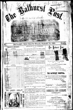 The Bathurst Post was first published on 15 August 1881 and printed by Glyndwr Whalan. It ceased publication on 15 March 1922, with issue number 486.[1] The publication was distributed free of charge, supported by advertising, and was intended by the proprietors to summarise news and other matters of interest for both a local and potentially wider audience.[2]