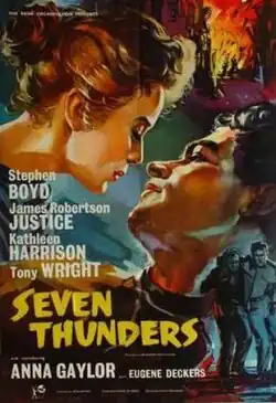 Seven Thunders (US title: The Beasts of Marseilles) is a 1957 black and white British film regarding Marseille in the Second World War. It was directed by Hugo Fregonese and starring Stephen Boyd, James Robertson Justice, Kathleen Harrison, Tony Wright and Anna Gaylor.[1] It is about two escaped prisoners of war and is based on a novel of the same name by the writer Rupert Croft-Cooke.[2]