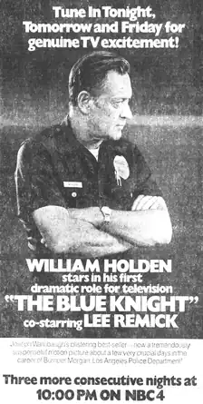 Holden said he was surprised to be cast as Morgan, as he thought Ernest Borgnine or Rod Steiger would have been preferred.[1] Shooting took seven weeks.[2] The Blue Knight was filmed as a four-episode miniseries of 60 minutes each for the US market and a 100-minute theatrical film for European markets.[3] It was one of the first miniseries on American television.[4]