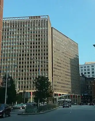 The Chesterfield Building is a 1965-erected high-rise 200-foot-tall, 20-story apartment building complex located in the Reserve Square area of downtown Cleveland.[1] The building was designed by Charles Luckman who is responsible for the Aon Center (Los Angeles), the Los Angeles Convention Center, the Madison Square Garden in New York and the AmTrust Financial Center in Cleveland among many others. The complex contains 407 living units and features distinctive windows that open out giving the impression that the building is an old factory, but the building has always been apartments.[2] The Chesterfield features a rooftop swimming pool and underwent major cosmetic (exterior) renovation in 2001.[3]