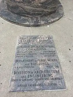 The idea for a statue was first proposed by Alderman John Hoellen in 1951 as a memorial to Abraham Lincoln.[3] This proposal was later submitted as a bill to the Illinois General Assembly and signed by Governor William Stratton. The proposal created a committee to plan how the structure was to be created. The committee decided to organize a nationwide contest, allowing individuals to submit designs and ideas for the new statue. A collector of Lincoln images, Lloyd Ostendorf, was declared the winner; Ostendorf won a $500 prize for his submitted sketch of Lincoln without his beard and standing up.[2] The statue was sculpted by Avard Fairbanks at a cost of $35,000.[2][3]