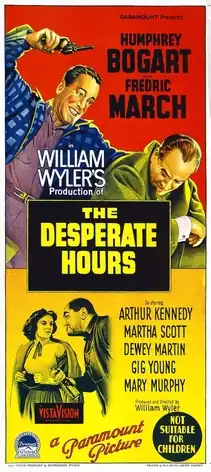 The Desperate Hours is a 1955 film noir starring Humphrey Bogart and Fredric March. It was produced and directed by William Wyler and based on the 1954 novel and 1955 play of the same name, written by Joseph Hayes, which were loosely built on actual events. The film takes place on the Northside of Indianapolis and took great pains to be accurate as to street names and locations within the city and Indiana in general.