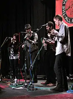 The Down Hill Strugglers, previously known as the Dust Busters, is an American old-time string band trio from Brooklyn, New York.[1] Formed in 2008, the band has been influenced by the music of rural America, including Appalachian traditions, music from the Deep South, and the Western States.[2] The band was originally made up of Craig Judelman, Eli Smith, and Walker Shepard. In 2012, Craig Judelman left the Dust Busters and was replaced by multi-instrumentalist Jackson Lynch. At the same time, the band changed its name to the Down Hill Strugglers.