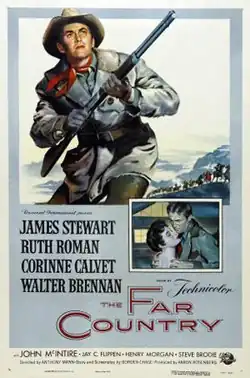 The Far Country is a 1954 American Technicolor Western film directed by Anthony Mann and starring James Stewart, Ruth Roman, Walter Brennan, John McIntire and Corinne Calvet. Written by Borden Chase, the film is about a self-minded adventurer who locks horns with an evil, corrupt judge while driving cattle to Dawson, Yukon Territory. It is one of the few Westerns to be set in Alaska — others include The Spoilers (1955) and North to Alaska (1960) — although it was not filmed there.[4] This was the fourth Western film collaboration between Anthony Mann and James Stewart. The supporting cast features Jay C. Flippen, Harry Morgan, Steve Brodie, Robert J. Wilke, Chubby Johnson, Royal Dano and Jack Elam.