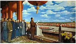 The Founding Ceremony of the Nation (or The Founding of the Nation) is a 1953 oil painting by Chinese artist Dong Xiwen. It depicts Mao Zedong and other Chinese Communist Party (CCP) officials proclaiming the People's Republic of China at Tiananmen Square on October 1, 1949. A prominent example of socialist realism, it is one of the most celebrated works of official Chinese art. The painting was repeatedly revised, and a replica painting made to accommodate further changes, as some of the leaders it depicted fell from power and later were rehabilitated.