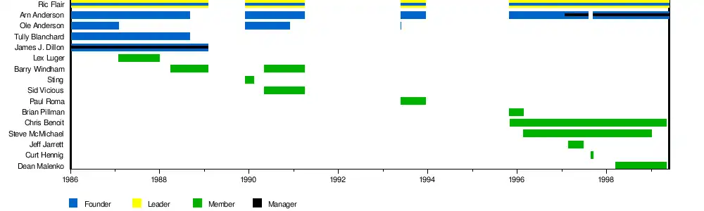 The stable originated in Jim Crockett Promotions as part of Mid Atlantic Championship Wrestling and later World Championship Wrestling for much of the 1980s and 1990s. Flair and Arn Anderson were members of each incarnation of the group until Anderson's retirement after a neck injury. As of 2022, Arn Anderson has the ownership of the stable's trademark and other intellectual properties.[2]