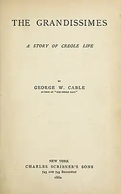 The Grandissimes: A Story of Creole Life is a novel by George Washington Cable, published as a book in 1880 by Charles Scribner's Sons after appearing as a serial in Scribner's.[1][2] The historical romance depicts race and class relations in New Orleans at the start of the 19th century, immediately following the Louisiana Purchase in 1803.[3] The book examines the lives and loves of the extended Grandissime family, which includes members from different races and classes in Creole society.[4] The novel juxtaposes a romanticized version of the French Creole culture with the atrocities committed under the European-American system of slavery in the United States.[5]