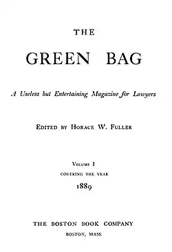 Charles Carroll Soule, owner of the Boston Book Company and publisher of The Green Bag, hired Horace Williams Fuller to be the first editor.[2] A contemporary publication reviewed the initial efforts of The Green Bag as follows: "Although primarily intended for the amusement of lawyers, this magazine should be a welcome guest at any library table. It is certainly one of the brightest, sprightliest and most entertaining of all the non-scientific journals that come to The Microscope's book-table. Well edited, beautifully printed, finely illustrated, it should meet with a cordial reception from any intelligent reader."[3]