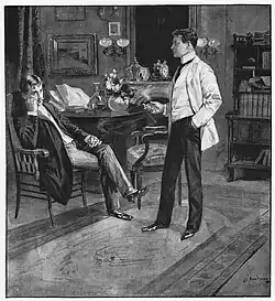 When printed in Cassell's Magazine, the story was renamed to "In the Chains of Crime". It included an introduction clarifying that Bunny was presently a prisoner, as well as an illustration showing Bunny Manders being dragged by a skeleton in cloak and hood. The magazine was hesitant to publish a story that featured criminals as the protagonists, and these changes were intended to make it clear that it was a cautionary tale. Cassell's would reprint this same illustration in each of its six Raffles issues.[5]