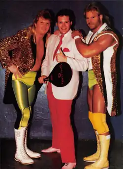 Together the three men won the AWA Southern Tag Team title in the CWA and invoked the "Freebird Rule" to allow any two of the three men to defend the titles on a given night.[4] The Midnight Express lost the AWA Southern tag team title to Bobby Eaton and Sweet Brown Sugar before returning to SECW in the spring of 1982.[1] Upon their return to Southeastern Championship Wrestling the Midnight Express quickly regained the Southeastern Tag Team title from Robert Fuller and Jimmy Golden on September 27, 1982. The Express then became involved in a feud with the Mongolian Stomper and his storyline son "Mongolian Stomper Jr.", with whom they traded the Southeastern title.[1] The Midnight Express's next challengers were "Dizzy Ed" Hogan and local wrestler Ken Lucas. The two teams repeatedly traded the title until the Midnight Express, using their 3-on-2 advantage, finally reclaimed the championship by the end of July 1983.[1] The Midnight Express's final feud in the SECW was with the local heroes Jimmy Golden and Robert Fuller, who managed to drive the group out of SECW.[2] After dropping the Southeastern Tag Team titles to Brad and Scott Armstrong, Austin, Condrey and Rose went their separate ways.
