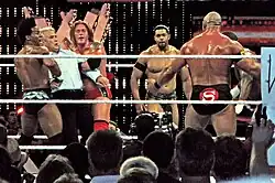 On the January 3, 2011 edition of Raw, The Nexus ambiguously announced after months of repeated attacks on Cena and the WWE roster that it was under "new management," with CM Punk (who disbanded the Straight Edge Society the previous September) being revealed to be the new leader, acquiring the position after Barrett lost a #1 contendership steel cage match involving Orton and Sheamus. Punk, having agreed to fall in line had Barrett successfully won the title shot, teased helping Barrett escape the cage before knocking him off of it. Barrett was subsequently exiled from The Nexus, which would be renamed "The New Nexus" to distance itself from former leadership.[34] After refusing to follow Punk's orders of initiation by hitting each other with kendo sticks, Gabriel and Slater left the group the following week on Raw, opting to join Barrett and former ECW Champion Ezekiel Jackson on SmackDown as The Corre while Harris, McGillicutty and Otunga successfully completed Punk's initiation.[35] On the January 17, 2011 edition of Raw, Mason Ryan joined The New Nexus after interfering in Punk's match against Cena, attacking both before Punk handed Ryan a Nexus armband.[36] On January 30, 2011 at the Royal Rumble, The New Nexus, who were also a part of the 40-man Royal Rumble match along with The Corre, cost Orton his rematch clause for Miz's WWE Championship, starting a feud with him.[37] Over the ongoing weeks, Orton defeated all members of The New Nexus, causing several storyline injuries by punting them.[38][39][40][41] At WrestleMania XXVII, Orton defeated Punk and, at Extreme Rules, Orton defeated Punk in a Last Man Standing rematch.[42][43] On the May 23, 2011 edition of Raw, thanks to a distraction from The New Nexus, McGillicutty and Otunga defeated Big Show and Kane for the WWE Tag Team Championship.[44] On the June 20, 2011 "Power to the People" edition of Raw, Punk was originally going to be named the number one contender for Cena's WWE Championship, but instead, he was forced to compete in a triple threat match with Alberto Del Rio and Rey Mysterio with a Falls Count Anywhere stipulation voted for by fans which Punk won, revealing after the match that his WWE contract would expire at Money in the Bank, where he would face Cena for the WWE Championship.[45] The following week on Raw, it was announced that Ryan suffered an injury over the weekend and left the group.[46] That same night, a brash Punk realized a worked shoot promo (which he dubbed a "pipe bomb"), reminding that once his contract expired at Money in the Bank, that would be the last time WWE would ever see him and the WWE Championship, as he considered taking his talents to another wrestling promotion, like Ring of Honor and New Japan Pro-Wrestling.[47] With his victory over Cena at Money in the Bank, the WWE Championship was finally held by the stable on their last night of existence.[48]