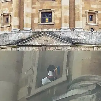 During May 2018, traffic cones began to litter the exterior walls of the Radcliffe Camera. The Night Climbers of Oxford claimed responsibility through anonymous Oxfess Facebook submissions. The cones were detailed with humorous content, supposedly designed to put students in a 'light-hearted' frame of mind. During Oxford's pride week the traffic cones were decorated with rainbow flags, showing the secret society's clear support for the movement. Other key political issues that are often pursued by the Night Climbers is that of inequality, elitism, and the homeless epidemic in Oxford.[6]