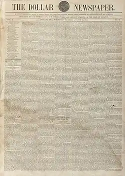Poe originally offered "The Oblong Box" to Nathaniel Parker Willis for the New Mirror, but Willis suggested it was better suited for the Opal, a gift book edited by Sarah Josepha Hale.[9] It was first published on August 28, 1844, in the Dollar Newspaper in Philadelphia.[10] It was also published in the September 1844 issue of Godey's Magazine and Lady's Book,[10] also edited by Hale.[9] The story was also reprinted in The Broadway Journal, in the Saturday, December 13, 1845, edition.[11]