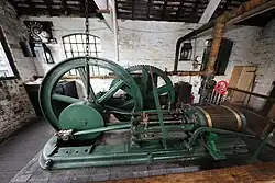 To the side of the brick engine shed is a small corrugated building which houses the engine and fan. This was installed to provide adequate ventilation in a mine. The engine is from Amblecote Fireclay Pit c1860 and was made by J. C. Stark of Torquay. It was found dismantled in the Orangery at Shugborough. The fan sucks the air from the pit. The upright part is called the evaze and is designed to dissipate the air.[4]