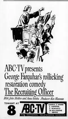 "The Recruiting Officer" is a 1965 Australian television production based on the famous play The Recruiting Officer, which was the first play ever performed in Australia.[2] "The Recruiting Officer" aired on 6 January 1965 in Sydney,[3] 13 January 1965 in Brisbane,[4] and on 20 January 1965 in Melbourne.[5]