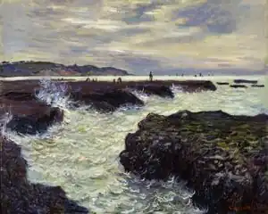 The Rocks at Pourville, Low Tide (1882) was considered as the part of Monet's art works in his improving stage. Regina Michelle Schreck-Gaskin highlights the psychological depth of Monet's 1880s works. She pointed out that Monet's late work was not only capturing landscapes and light but also adding personal symbolism, incorporating Monet's own experience in life and tourism. Schreck-Gaskin argues that Monet's paintings of the Normandy coast, beginning in the 1880s, reflected a conscious struggle to control time and nature through art, but this problem was solved in later 1890s series of works based on Monet's discovery of a more abstract way of symbolism.[11] The stylistic evolution of Monet's later work echoes his personal struggles, particularly the emotional transition following the death of his first wife, and his complicated relationship with Alice Horschede, which are also reflected in the paintings of the 1880s, in which Monet sought to find a balance between landscape, people, and time.[1] In the 20th century, due to Monet's lack of vision, his work gradually transitioned to a more abstract style, and his later works influenced modern art movements such as abstract expressionism.[3]