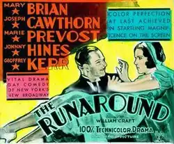 The Runaround is a 1931 comedy-drama film that was photographed entirely in Technicolor. It was directed by William James Craft, from a screenplay by Alfred Jackson and Barney Sarecky, based on a story by Zandah Owen. The film stars Mary Brian, Joseph Cawthorn, Marie Prevost, Johnny Hines, and Geoffrey Kerr. Produced and directed by RKO Radio Pictures, it premiered in New York City on August 7, 1931, and was released national on August 22. It was the first film to be shot in a new Technicolor process which removed grain, resulting in a much improved color. The film was released in Great Britain as Waiting for the Bride.