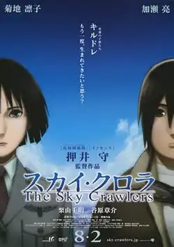 The Sky Crawlers (スカイ・クロラ, Sukai Kurora) is a 2008 Japanese adult animated war film, directed by Mamoru Oshii. It is an adaptation of Hiroshi Mori's novel of the same name. It was released across Japanese theatres by Warner Bros. Japan on August 2, 2008.[2][3][4] Animated by Production I.G, the film was written by Chihiro Itō, featuring character designs by Tetsuya Nishio and music by Kenji Kawai.[2][3] The 3D CG animation for the movie was produced by the Polygon Pictures studio, who also produced the 3D CG for Oshii's previous film Ghost in the Shell 2: Innocence.