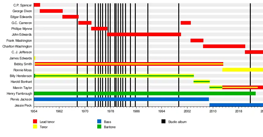 | Past members | Henry Fambrough Pervis Jackson Billy Henderson C. P. Spencer James Edwards Bobby Smith George Dixon Edgar "Chico" Edwards G. C. Cameron Philippé Wynne John Edwards Frank Washington Harold "Spike" Bonhart Charlton Washington |