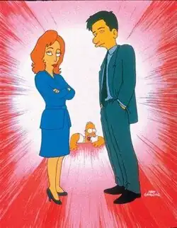"The Springfield Files" is the tenth episode of the eighth season of the American animated television series The Simpsons. It originally aired on the Fox network in the United States on January 12, 1997.[2] In the episode, Homer believes he has discovered an alien in Springfield. It was written by Reid Harrison and directed by Steven Dean Moore. Leonard Nimoy guest stars as himself and David Duchovny and Gillian Anderson guest star as agents Fox Mulder and Dana Scully, their respective characters on The X-Files.[2] The episode serves as a crossover with The X-Files and features numerous references to the series. The story came from former showrunners Al Jean and Mike Reiss, who returned to produce this episode while under contract with The Walt Disney Company. It received positive reviews from critics; Jean and Reiss won an Annie Award for producing it.