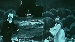 Running at 12 minutes long,[5] intertitles are used to link the short scenes but do not use Shakespeare's own prose. Several elaborate scenes were filmed in the studio which drew on Percy Stow's trick-photography expertise, including where Prospero summons up the tempest, which the BFI describes as being reminiscent of the work of the French film pioneer Georges Méliès.[3] The scene where Ariel disappears and reappears while being chased by Ferdinand was achieved by simply using a jump cut - stopping filming and the actress moving in and out of shot.[2] The scene is comic and emphasises the playful nature of Ariel but is also an effect that could not be replicated on stage giving the film an advantage over the theatre in what Judith Buchanan called an 'ambiguity of styles'.[4][6]