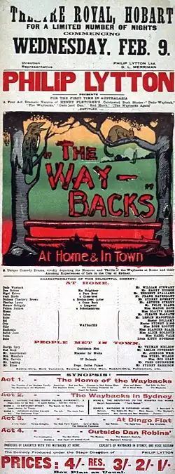 The Waybacks, also known as The Waybacks at Home and in Town, was a 1915 Australian play by Philip Lytton which was adapted from the stories by Henry Fletcher about the comic adventures of a rural family. The play was seen as attempt to cash in on the success of the theatre version of On Our Selection, and enjoyed almost as much popularity at the box office during its original run.[4][5][6]