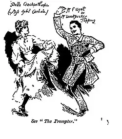 On 15 November 1873, Gilbert's play The Wedding March debuted at the Court Theatre, written under his pseudonym F. Latour Tomline. It was a free adaptation of Eugène Marin Labiche's Un chapeau de paille d'Italie ("The Italian Straw Hat"). The play was first to have been called Hunting a Hat, but the title was changed to capitalise on the popularity of the wedding march from Wagner's Lohengrin.[1] The name of the hero, Woodpecker Tapping, was taken from Thomas Moore's ballad, "The woodpecker tapping the hollow beech tree." The play ran for about 92 performances, until 3 March 1874, a good run for the time.[2] On the play's success, Stedman notes: