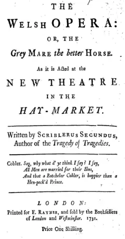 The Welsh Opera is a play by Henry Fielding. First performed on 22 April 1731 in Haymarket, the play replaced The Letter Writers and became the companion piece to The Tragedy of Tragedies. It was also later expanded into The Grub-Street Opera. The play's purported author is Scriblerus Secundus who is also a character in the play. This play is about Secundus' role in writing two (Fielding) plays: The Tragedy of Tragedies and The Welsh Opera.