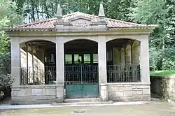 In 1929, a Comissão de Iniciativa (Initiative Commission) introduced improvements at the thermal station. Sections of the women's bathrooms were remodelled, in addition to the installation of a laboratory on site to analyze the waters, as well as an extension that acted as pharmacy.[1] The administrative council also deliberated on expropriation of lands that pertained to the Viscountess of Peso.[1] On 23 March 1930, a notice was issued to attribute a Sevilha Exposition gold medal to the waters of Melgaço. Arborization of the park continued in May, with the planting of trees to provide shade, in addition to flowering plants and fruit trees.[1] Notice on the opening of the change rooms was issued on 8 June, under the direction of Dr. Athias Ark, in addition to providing information on pricing practiced at the site.[1] An article published in August, by the Notícias de Melgaço, referred to the avenues of the park that crossed the property east to west, that connect a new spring that had been discovered, covered in a wooden structure.[1]