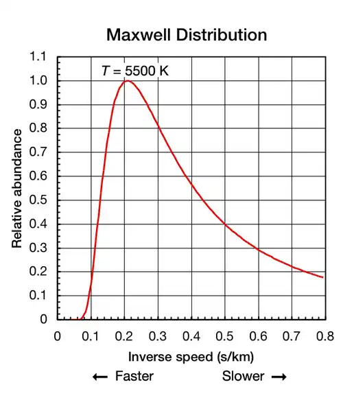 While the Boltzmann constant is useful for finding the mean kinetic energy in a sample of particles, it is important to note that even when a substance is isolated and in thermodynamic equilibrium (all parts are at a uniform temperature and no heat is going into or out of it), the translational motions of individual atoms and molecules occurs across a wide range of speeds (see animation in Fig. 1 above). At any one instant, the proportion of particles moving at a given speed within this range is determined by probability as described by the Maxwell–Boltzmann distribution. The graph shown here in Fig. 2 shows the speed distribution of 5500 K helium atoms. They have a most probable speed of 4.780 km/s (0.2092 s/km). However, a certain proportion of atoms at any given instant are moving faster while others are moving relatively slowly; some are momentarily at a virtual standstill (off the x-axis to the right). This graph uses inverse speed for its x-axis so the shape of the curve can easily be compared to the curves in Fig. 5 below. In both graphs, zero on the x-axis represents infinite temperature. Additionally, the x- and y-axes on both graphs are scaled proportionally.