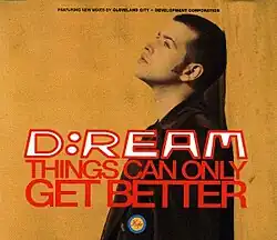 "Things Can Only Get Better" is a song by Northern Irish musical group D:Ream, released in 1993 by Magnet Records and FXU as the second single from the group's debut album, D:Ream On Volume 1 (1993). It was written by Peter Cunnah and Jamie Petrie, and was a sleeper hit. The single was remixed and re-released in December 1993, to coincide with the band being a support act for Take That's UK tour, spending four weeks at number one. The song also reached the top 10 in eight countries. In the US, it peaked at number seven on the Billboard Hot Dance Club Play chart. Its accompanying music video was directed by James Lebon and was nominated for the International Viewer's Choice Award at the 1994 MTV Europe Music Awards. At the same award, D:Ream earned a nomination for Best Dance Act.[5] "Things Can Only Get Better" was also nominated in the category for Tune of the Year at the International Dance Awards 1995.[6]