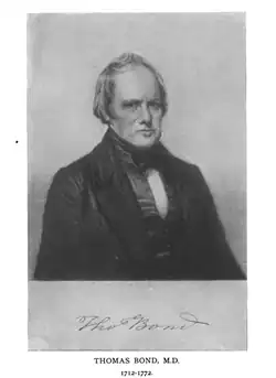 Thomas Bond (May 2, 1713 – March 26, 1784) was an American physician and surgeon.[1] In 1751 he co-founded the Pennsylvania Hospital, the first medical facility in the American colonies, with Benjamin Franklin, and also volunteered his services there as both physician and teacher.[2]