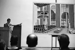 Thomas Huber is an artist who fuses image and text and lectures on his pictures. He realises his conception of the image in various mediums: paintings, aquarelle, drawings, objects, graphic arts, art within architecture, artist lectures, and artists books. For instance, his painting Rede in der Schule ("Lecture in the School") depicts the main auditorium in the Kunstakademie Düsseldorf.