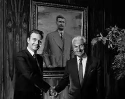 Baťa and his son in front of a portrait of Tomáš Baťa