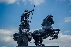 Thornycroft also worked on a monumental representation of Boadicea and Her Daughters,[2] exhibiting a "Colossal head of Boadicea, a part of a chariot group now in progress" in 1864.[9] A short biography published that year said he had already been working on it "at intervals" for many years.[3] The sculpture was not cast in bronze until 1902, 17 years after his death,[2] when it was installed on a plinth on the Victoria Embankment, by Westminster Bridge, London.[10] The figures are shown in a chariot with scythed wheels, drawn by two horses.[10]
