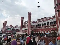After completing the works there, on 21 April, they commenced the second schedule in New Delhi.[79] A sequence featuring Haasan, Silambarasan and around 200 background artists were reportedly shot behind the Red Fort on 23 April.[80] Both the actors, along with Nassar, Abhirami, Vaiyapuri and Malhotra began filming a portion on 6 May at the Sankat Mochan Hanuman Temple,[81] which went on for three hours from 6 am to 9 am, to avoid mid-day summer heat. After completing the filming there, they moved to Old Delhi to shoot a certain indoor sequence.[82] A picture featuring the actors at the temple was leaked on social media the same day,[83] forcing the makers to release an official announcement confirming the casting of Silambarasan two days later.[84] The team shot at Sankat Mochan Hanuman Temple, Tughlaqabad Fort and Pataudi Palace in this schedule which was wrapped on 12 May.[85]