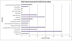 Since the 1881 census on local industries there have been large changes in occupation of residents. Agriculture is no longer the primary industry, with just 18 residents out of the 430 who are aged 16 – 74 and in work. Manufacturing has become the primary industry with 100 people being involved in a type of manufacturing in food, textiles or technology. Overall the employment data has moved with the times, with primary work becoming less prominent within communities, and the prominence of secondary and tertiary industries increasing.