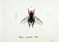 Thyreophora cynophila was originally described by Georg Wolfgang Franz Panzer in 1798, under the name Musca cynophila. He described it in German as Hundefliege ("dog-fly"), having found it on the carcass of a dog in Mannheim.[2] The animal is nearly 10 millimetres (0.39 in) long, and the head is bright orange in colour, while the body and legs are metallic blue; the wings bear a pair of black spots.[2] In 1803, Johann Wilhelm Meigen transferred the species to a new genus, Thyreophora, which means "shield-bearer", in reference to the enlarged scutellum in the male.[2] (The name Thyreophora is also used for a dinosaur suborder.)[2] Later reports extended the species' geographical range to include France and Austria, and some reported that the fly had a luminous head.[2]